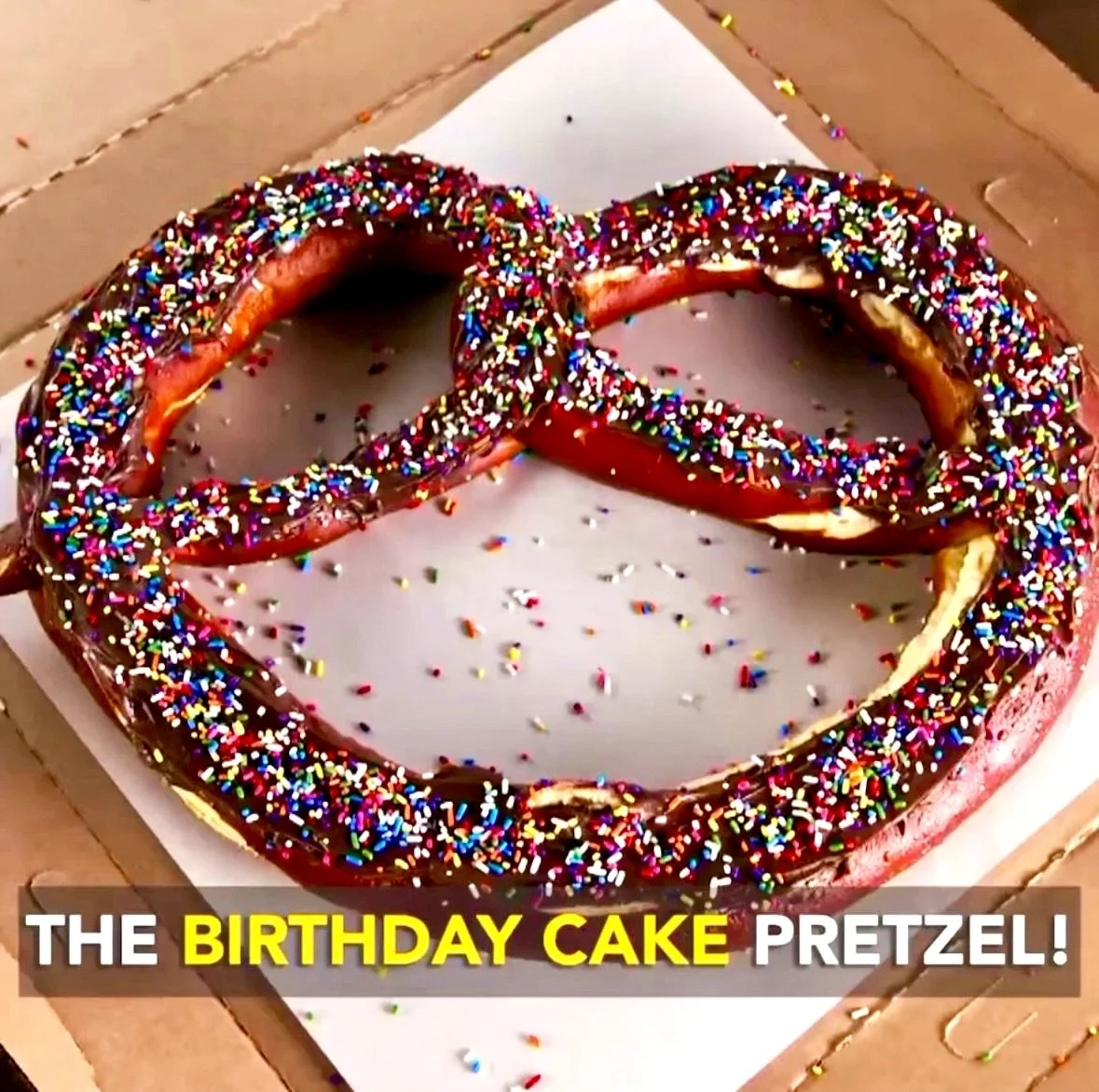 A giant Pretzel stuffed with cake and topped with frosting and sprinkles – feeds 6-10 people